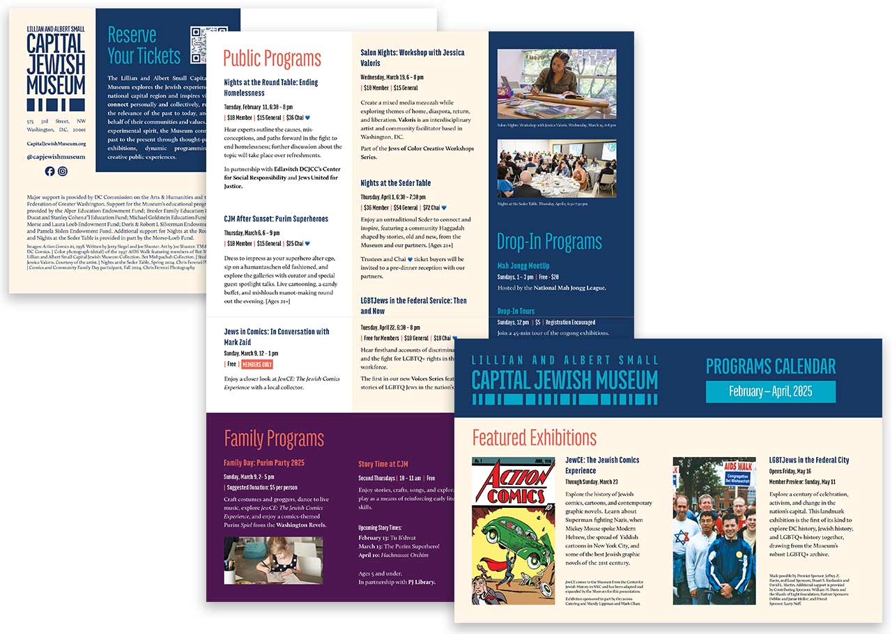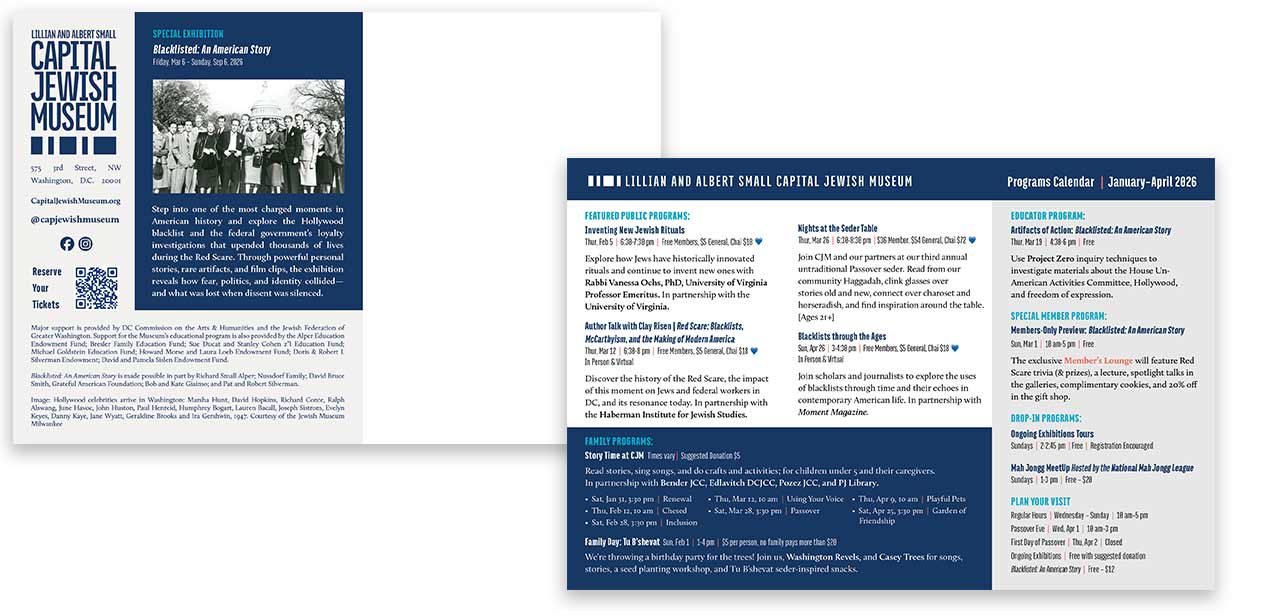 Design of seasonal public programs mailers. These oversized postcards vary between flat cards and folded mailers and show the evolution of the Museum’s branding.